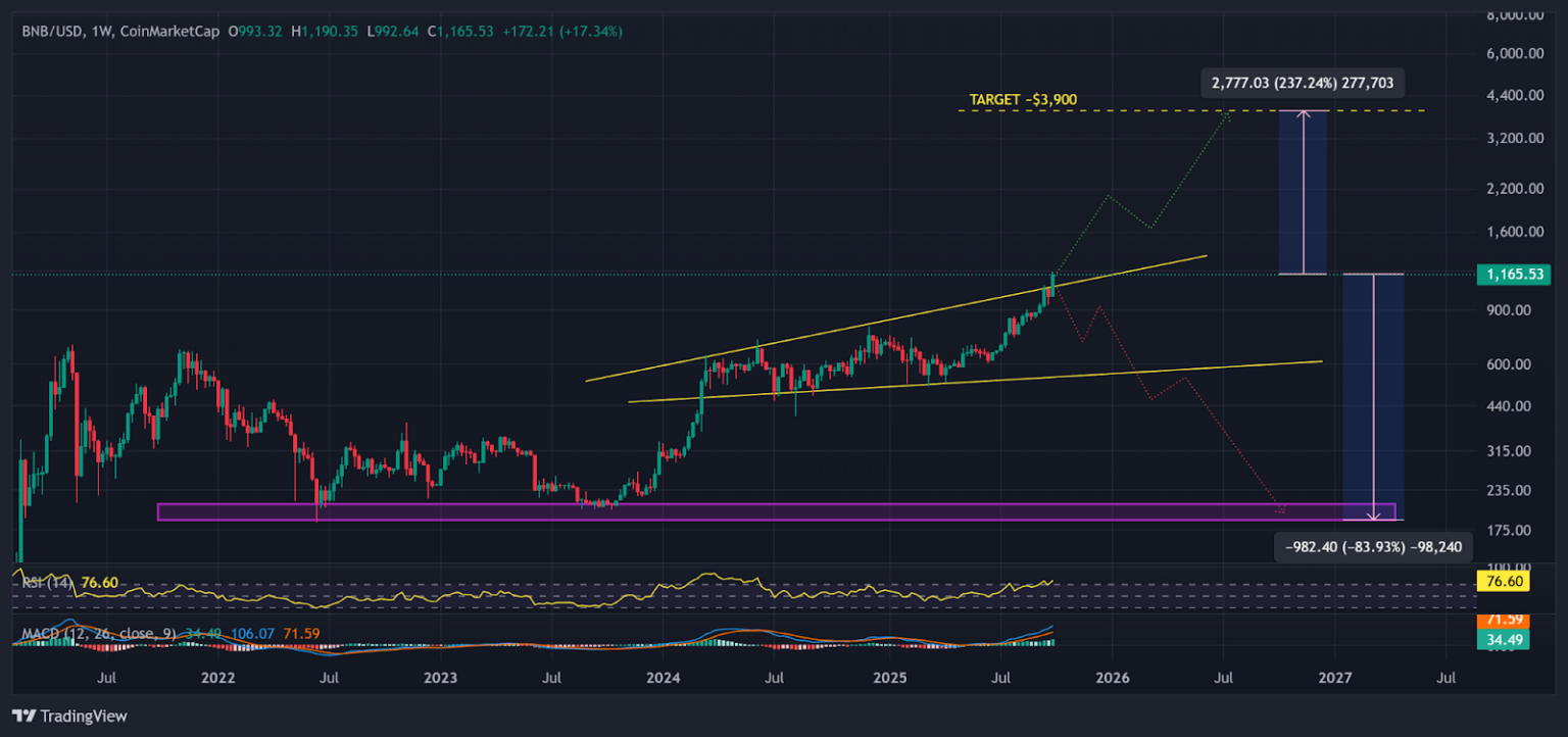 يُظهر الرسم البياني الأسبوعي أن سعر BNB يتحرك داخل قناة صاعدة، ما يشير إلى اتجاه صعودي طويل الأمد مع احتمالات استمرار النمو.