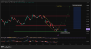 ويُظهر مؤشر MACD إشارات مبكرة على تقاطع صعودي، فيما قد يفتح تجاوز نطاق المقاومة الحمراء بين 0.48–0.50 دولار الباب أمام صعود واسع نحو 1 دولار.