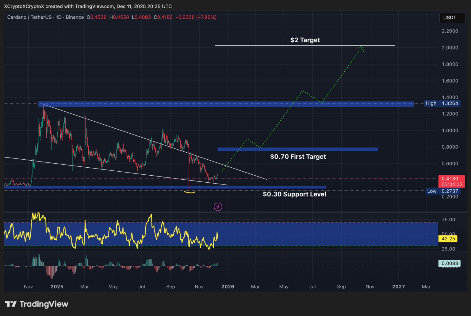 يُظهر الرسم البياني اليومي لعملة كاردانو أن السعر يتمركز عند نهاية نموذج وتد هابط طويل الأمد، تشكّل منذ ذروة الدورة السابقة في السوق.