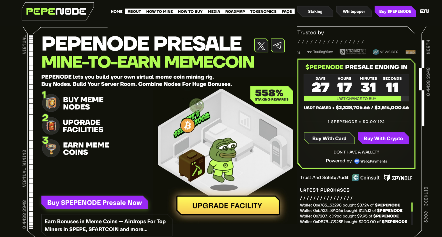 يتيح PEPENODE للمستخدمين بناء منصات افتراضية لتعدين عملات الميم، والبدء في تحقيق دخل سلبي بسهولة تامة ودون تعقيدات.