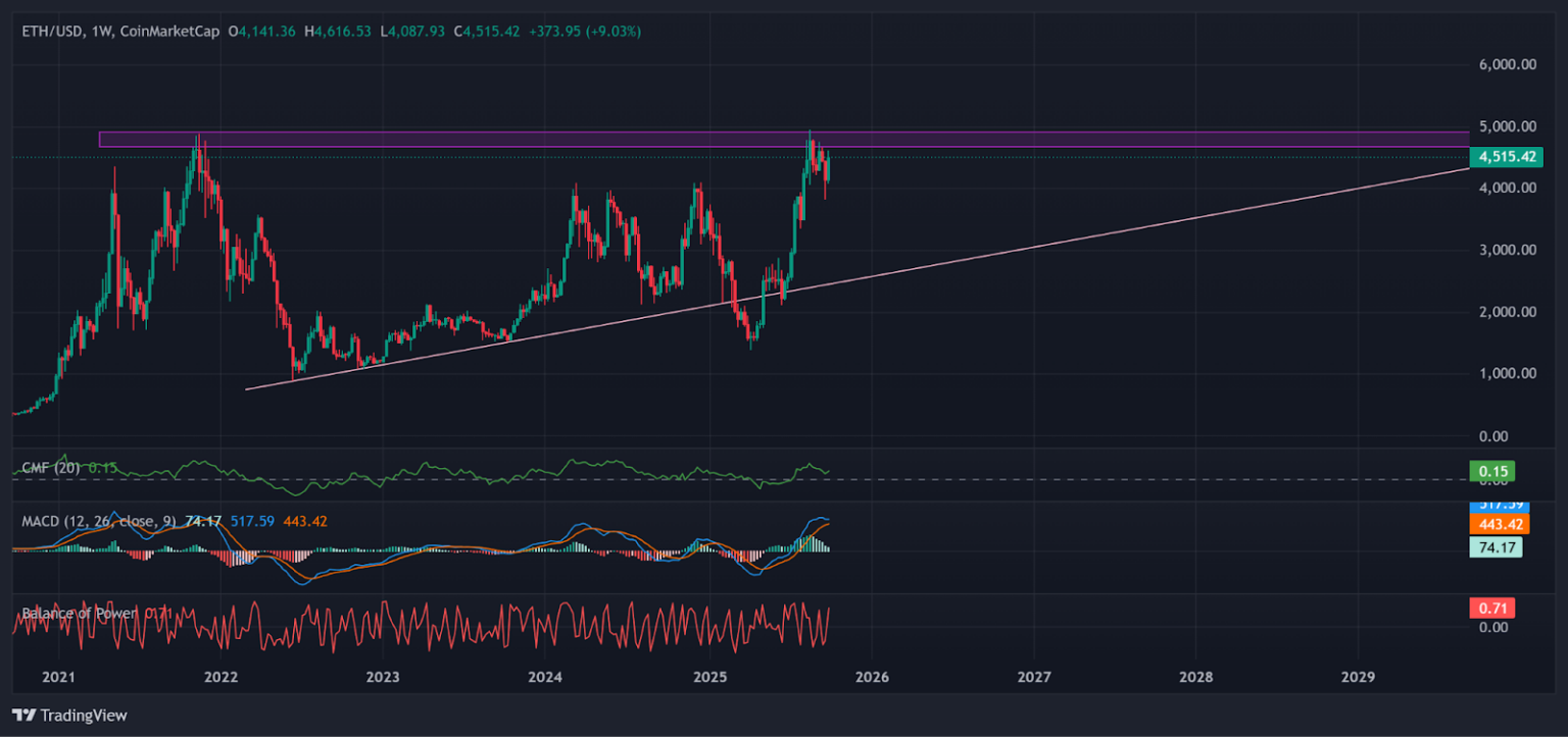 يُظهر الرسم الأسبوعي لزوج ETH/USD أن الأصل يتحرك حاليًا قرب منطقة مقاومة محورية دون مستوى 5,000 دولار، وهي منطقة كانت تاريخيًا بمثابة منطقة عرض يزداد فيها ضغط البيع.