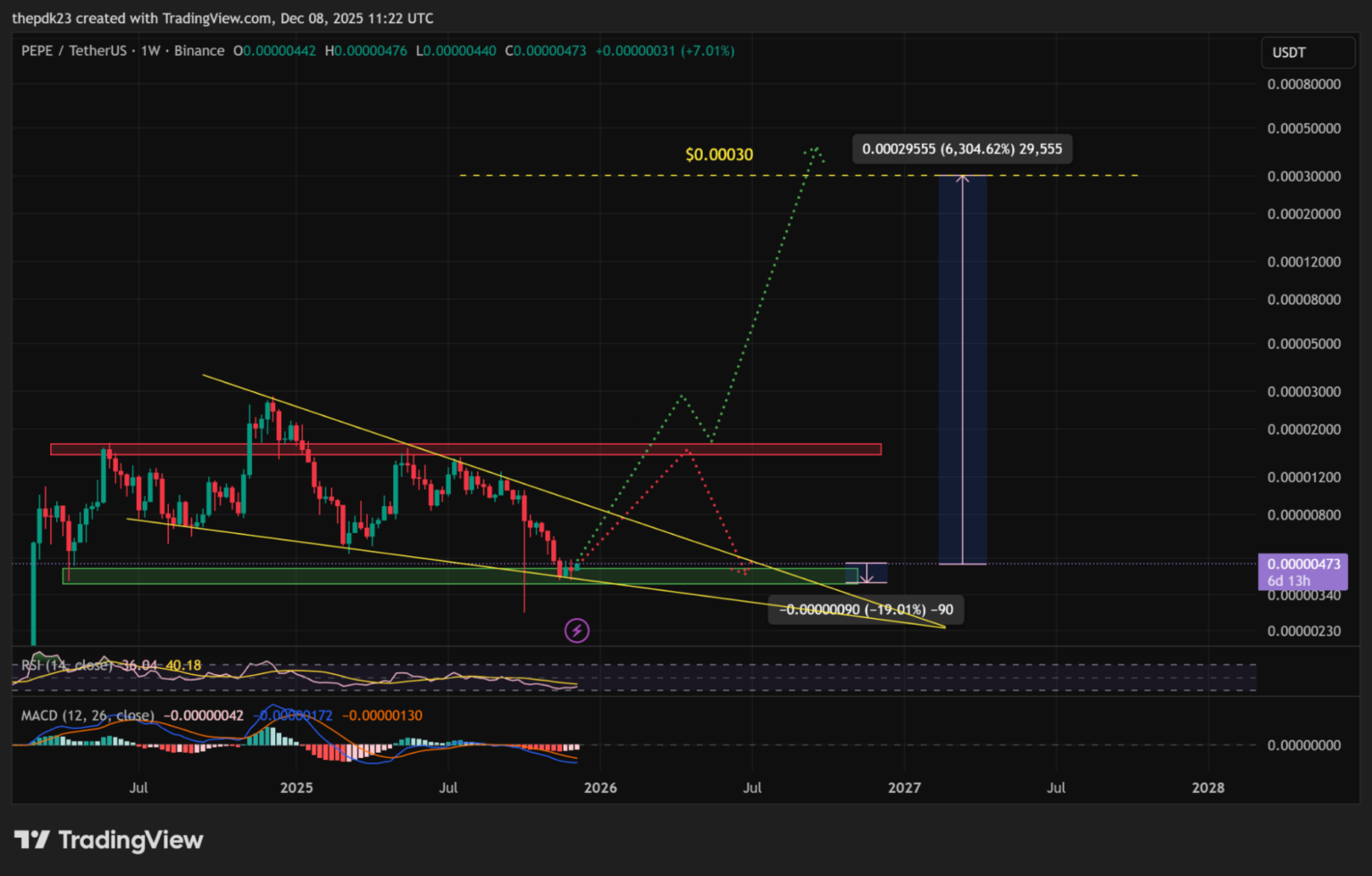 يقع سعر PEPE الآن أعلى بقليل من قاعدة محورية شكّلت مستوى دعم لأكثر من عام.