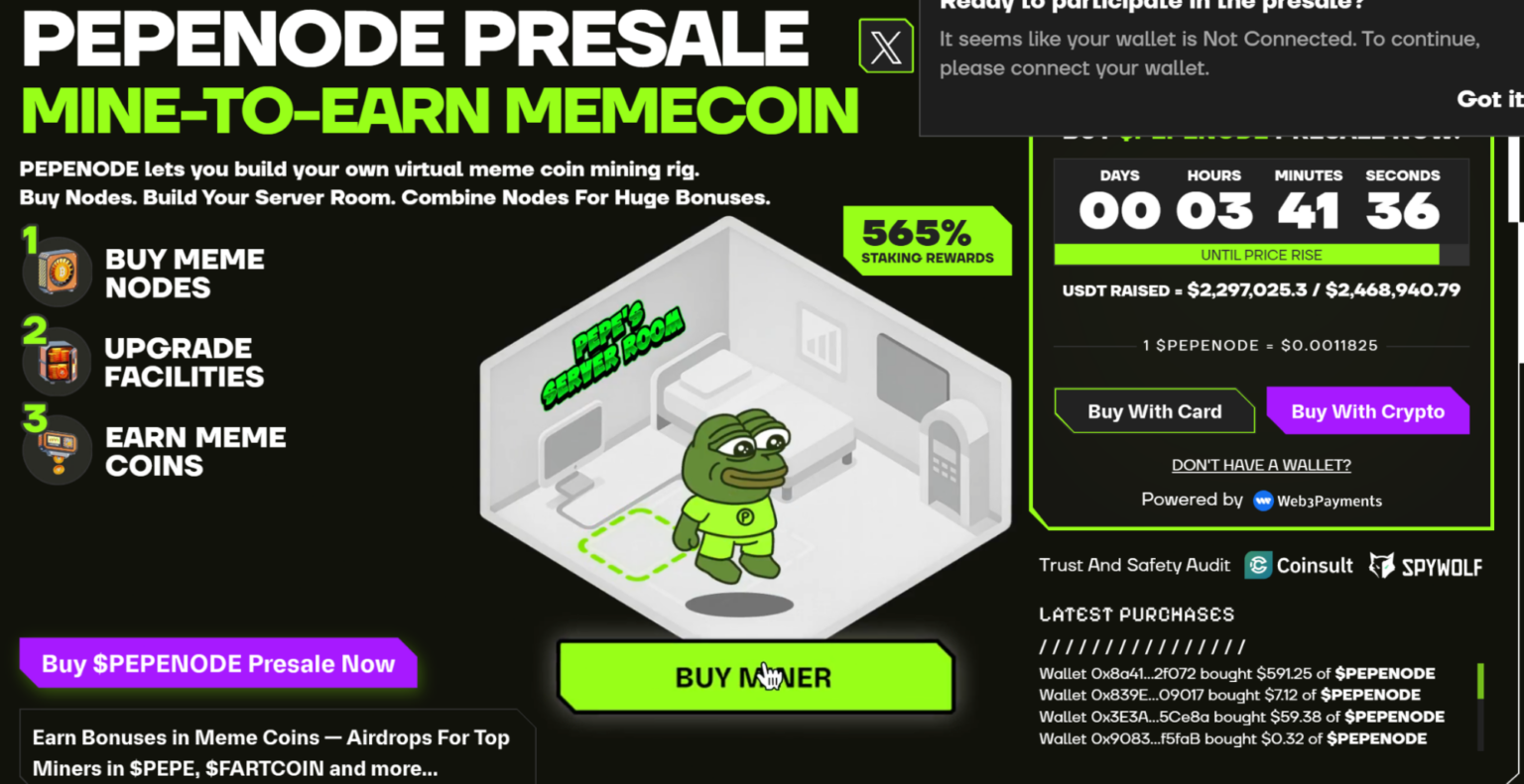 للمشاركة، توجّه إلى الموقع الرسمي لـ PEPENODE وربط محفظة مدعومة مثل Best Wallet.