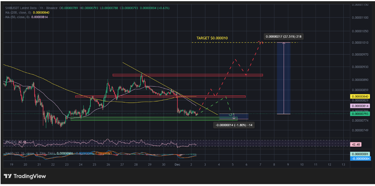 هبط سعر شيبا إينو SHIB إلى قاع يومي قرب 0.00000789 دولار، وواصلت سلسلة خسائر استمرت أربعة أيام، لتتراجع عن موجة الصعود التي شهدتها في أواخر نوفمبر عندما اقترب السعر من 0.00000913 دولار.