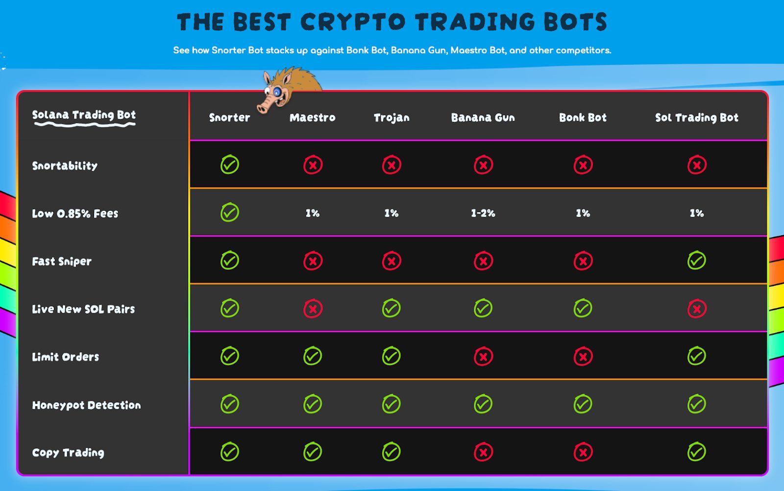 وبالمقارنة مع روبوت Maestro وBanana Gun، يبرز روبوت سنورتر لكونه مبنياً على بلوكتشين سولانا (Solana Blockchain)، فيما تم بناء كلٍّ من روبوت Maestro وBanana Gun على بلوكتشين إيثيريوم (Ethereum Blockchain)، حيث تجعل قيود الشبكة -مثل بطء أوقات معالجة الكتل على البلوكتشين والقدرة المحدودة والاعتماد على رسوم الغاز- أداءَهُما أقلَّ كفاءة.