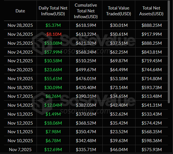 وعبر جميع صناديق سولانا المتداولة، ارتفعت التدفقات الإجمالية إلى 618.59 مليون دولار، بينما صعدت الأصول المُدارة إلى 888.25 مليون دولار. وحافظت نشاطات التداول على قوتها، إذ وصلت أحجام التداول إلى 30.01 مليون دولار. كما واصل صندوق BSOL الصدارة بإدارته 527.79 مليون دولار بمفرده.