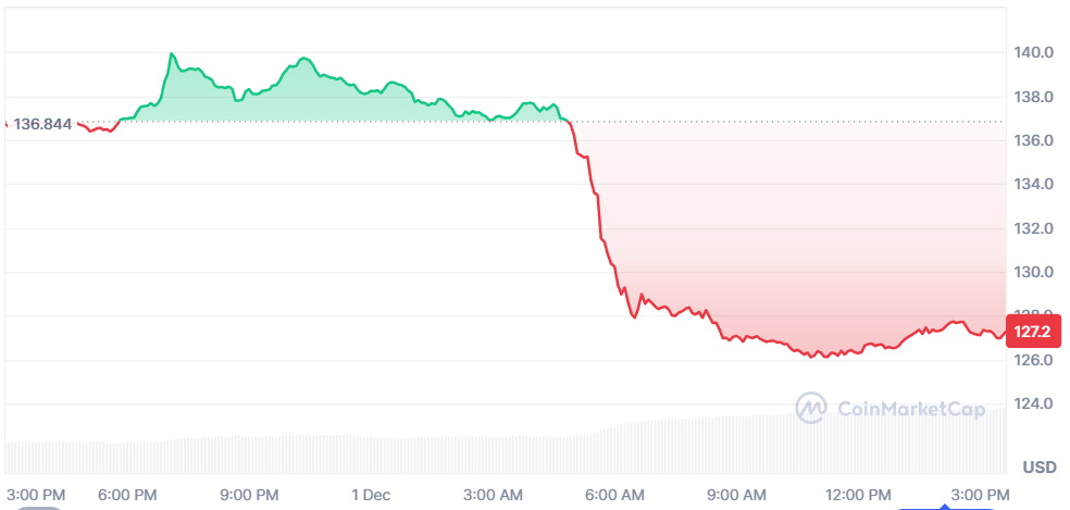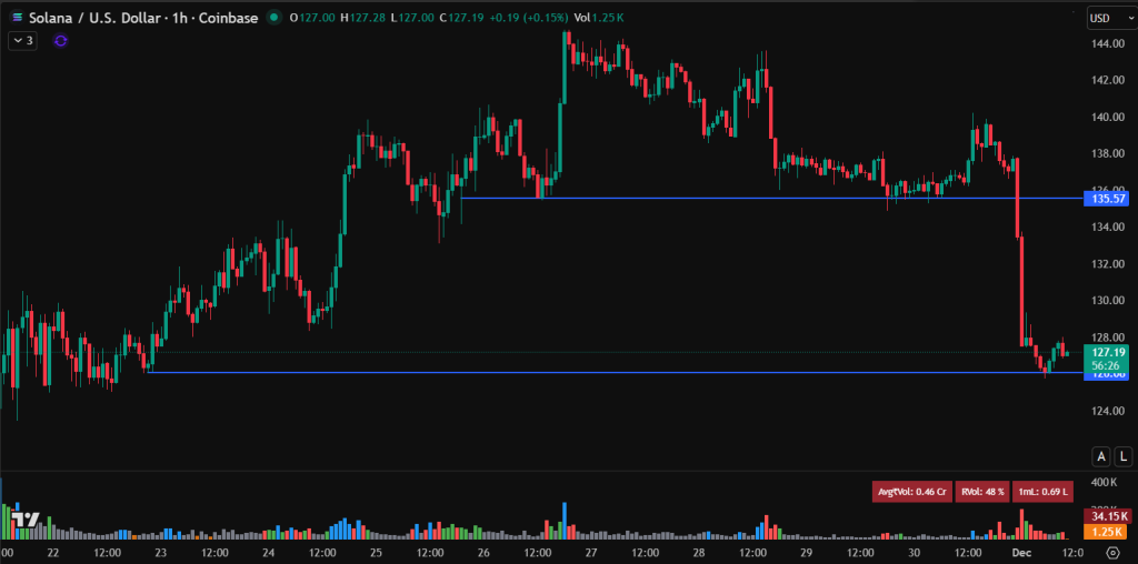 يتحرك سعر سولانا نحو منطقة حاسمة، إذ يتداول سعر العملة الآن فوق مستوى الدعم الرئيسي عند 125 دولار. ومع دخول ديسمبر، واصل السوق الهبوط نحو منطقة دعم قوية، بعدما حافظ البائعون على سيطرتهم لشهرين متتاليين عقب رفض السعر من المستويات العليا.
