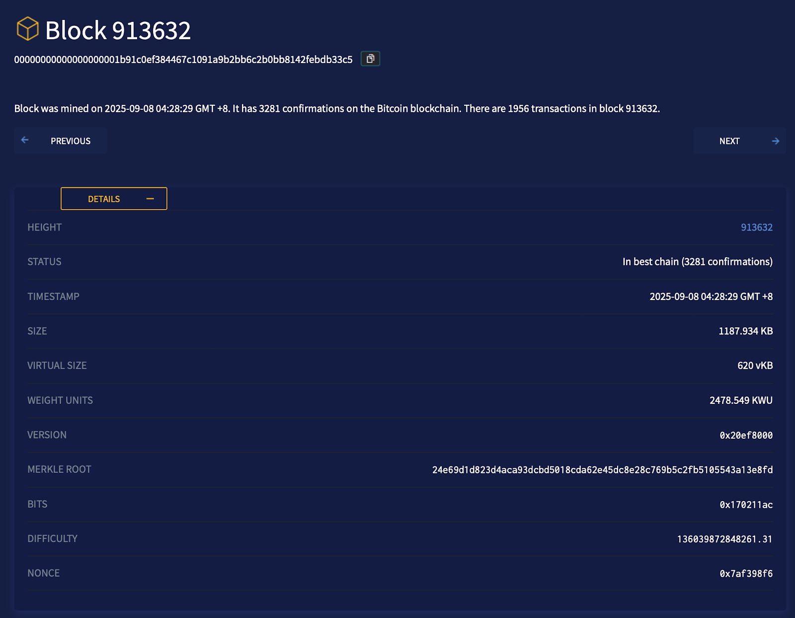 المصدر: https://btcscan.org/block/00000000000000000001b91c0ef384467c1091a9b2bb6c2b0bb8142febdb33c5?expand