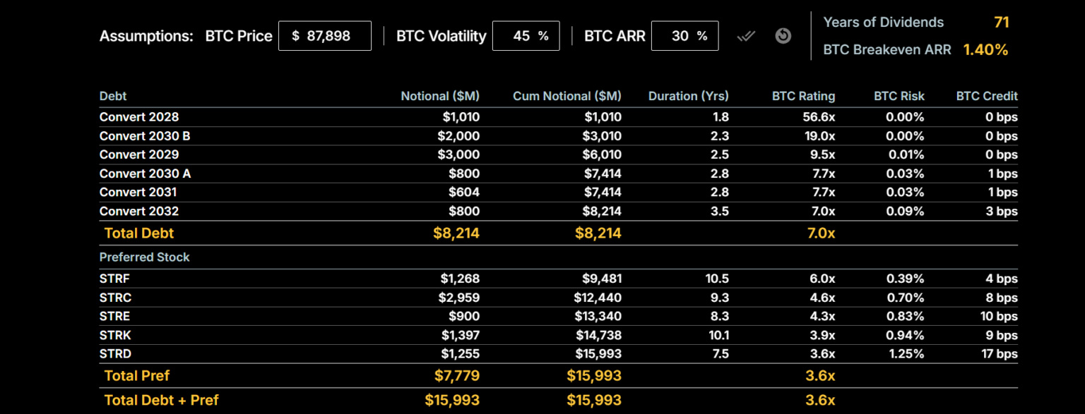 تطلق Strategy على هذا المقياس اسم “تصنيف BTC”، االذي يعد أحد أهم أدوات الشركة لطمأنة السوق بخصوص ملاءتها المالية. وحتى لو هبط سعر البيتكوين إلى 25 ألف دولار، تقول الشركة إن مستوى التغطية سيظل عند 2×، وهو مستوى غير مريح لكنه ما يزال أعلى بكثير من منطقة الخطر المتعلقة بعجز السداد.