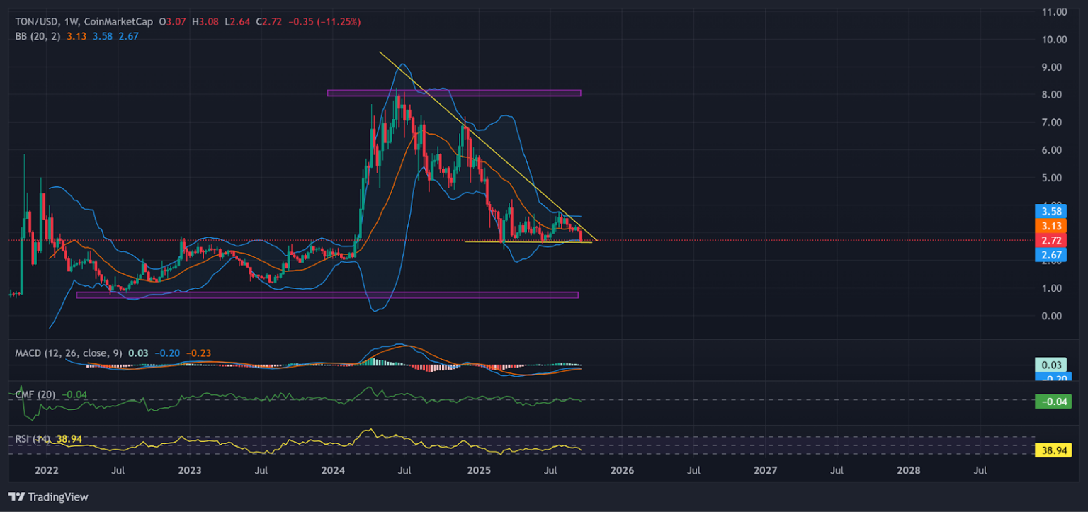 وفقًا للرسم البياني الأسبوعي، يتحرك Toncoin داخل نموذج مثلث هابط، حيث يتداول حاليًا عند 2.72 دولار بالقرب من الحد السفلي للنموذج مع دعم عند 2.67 دولار.
