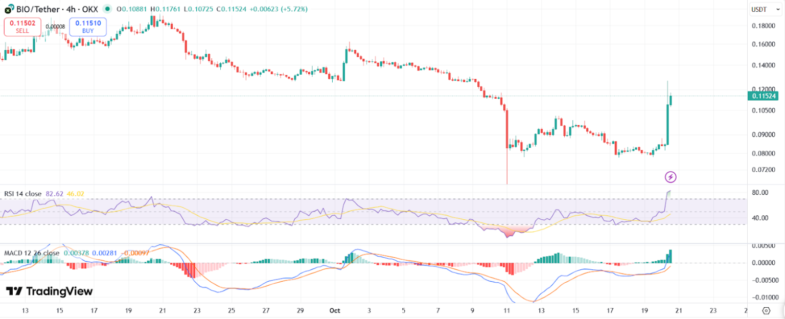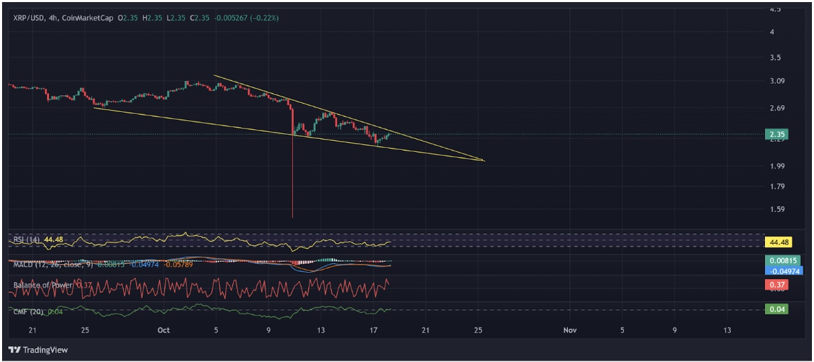 يُظهر الرسم البياني لمدة 4 ساعات لعملة XRP تشكّل نمط الوتد الهابط، وهو عادةً إشارة إلى انعكاس صعودي محتمل. وبعد اختبار الحد السفلي للنطاق قرب 2.20 دولار، بدأت العملة في التحرك تدريجيًا نحو الحد العلوي عند نحو 2.35 دولار.