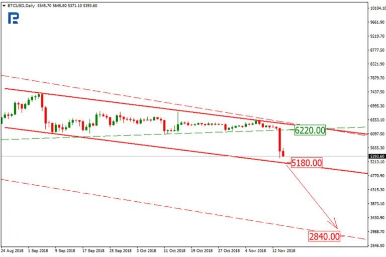 While crypto traders and investors are worried about the current situation, technically, Bitcoin is going along its long term downtrend, with yesterday’s fall being a strong move after a long consolidation phase. Thus, the lower boundary breakout was quite natural. The immediate downtrend target is the midterm channel support at $5,180, after which a short term pullback may be expected. If the support gets broken out, the price may well reach the major support at as low as $2,840.