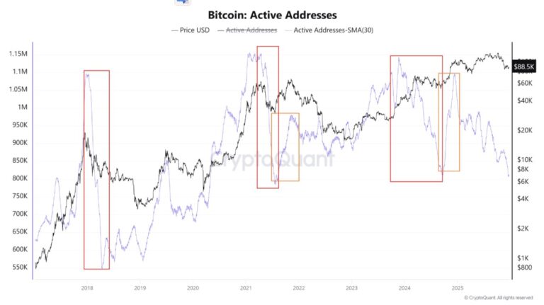 The divergence has yet to reverse from there for any meaningful recovery. The firm added that active address counts are now falling sharply, indicating reduced network engagement.