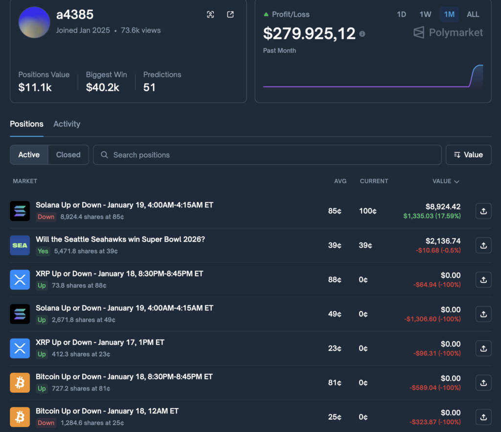 Im Profil von @a4385 steht ein Allzeit-Profit von 279.925,12 US-Dollar. In der Historie finden sich seine Wetten. Sein rentables Vorgehen scheut auch vor anderen Märkten nicht: Er hat es auch mit Bitcoin-Wetten versucht und am heutigen 19. Januar hat er eine Wette auf “Down” für Solana laufen.