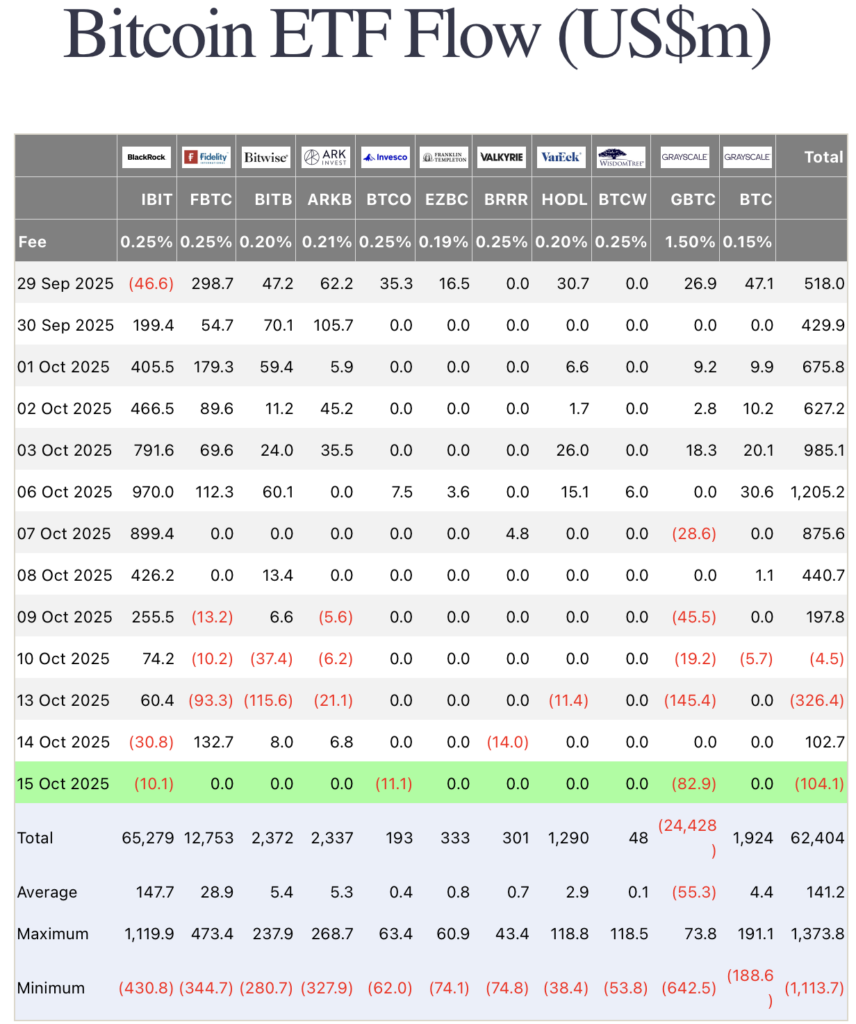 Auch die ETF-Ströme zeichnen ein wechselhaftes Bild. Nachdem laut Farside Investors noch in der Woche zuvor der zweithöchsten Zufluss seit Start aufgezeichnet wurde, summieren sich nun die Nettoabflüsse der US-Spot-Bitcoin-ETFs in den letzten Tagen wieder; allein am 13.10.2025 flossen rund 326 Millionen US-Dollar ab.