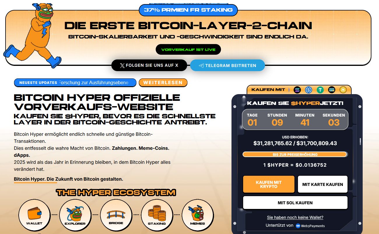 Im laufenden Presale wurden bereits rund 31,5 Millionen US-Dollar eingesammelt – ein Wert, der auf erhebliches Investoreninteresse schließen lässt. Dieses Kapital signalisiert Vertrauen in die Idee, dass Bitcoin durch Layer-2-Erweiterungen einen neuen Wachstumsschub erfahren könnte. Sollte es gelingen, echte Nutzung – etwa im Bereich DeFi, Tokenisierung oder schneller Zahlungsabwicklung – auf Bitcoin zu bringen, würde sich die Nachfragebasis verbreitern. Der Kauf von HYPER gelingt aktuell sogar noch im Presale, für 38 Prozent APY.