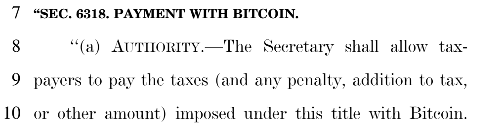 Kernstück des Gesetzentwurfs ist die Einführung eines neuen Paragrafen § 6318 „Payment with Bitcoin“ in die US-Steuerordnung. Der Treasury Secretary (Finanzminister) soll ausdrücklich befugt werden, Steuerzahlern zu erlauben, Steuern, Säumniszuschläge und weitere Beträge in Bitcoin zu begleichen. Eine Zahlung gilt als geleistet, wenn der Steuerzahler Bitcoin irreversibel an eine vom Finanzministerium designierte Bitcoin-Adresse überweist oder an eine von einem „financial agent“ (reguliertes Finanzinstitut) verwaltete Adresse transferiert und die Transaktion die vom Minister festgelegte Anzahl an Netzwerkbestätigungen erreicht hat.
