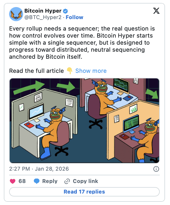 In einem aktuellen Update beschreibt Bitcoin Hyper mehrere Ansätze zur schrittweisen Dezentralisierung des Sequencers, darunter rotierende Betreiber oder transparente Auktionsmodelle.