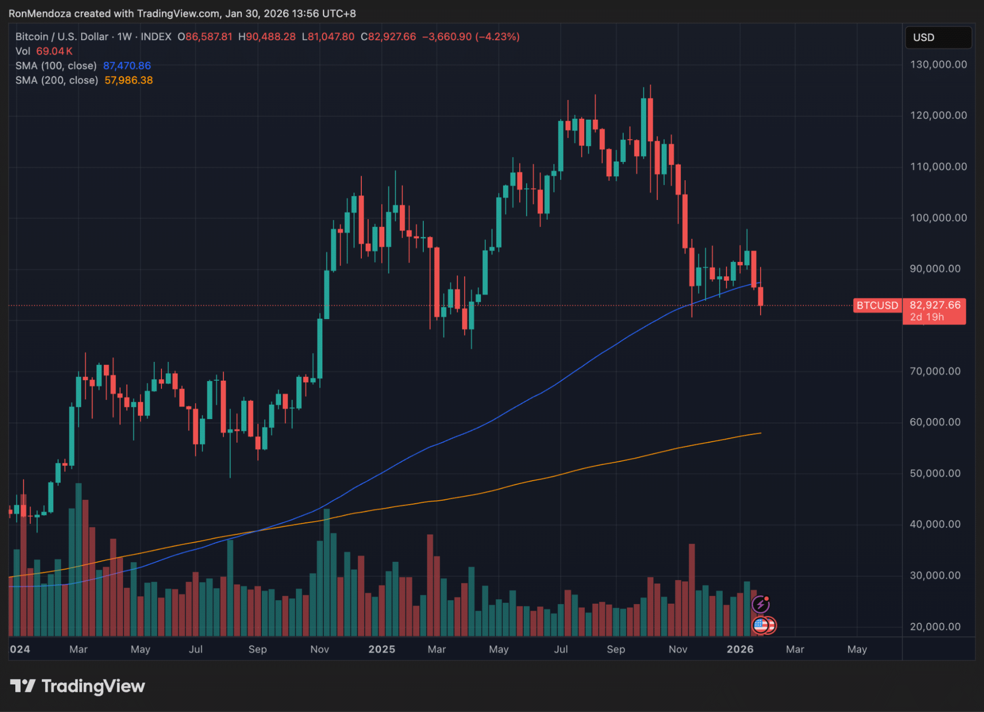 Technisch gesehen zwang der Fall unter 85.000 US-Dollar BTC außerdem unter seinen 100-Wochen-Gleitenden Durchschnitt, der derzeit nahe 87.250 US-Dollar liegt. Dieser Bruch signalisiert eine deutliche bärische Dynamik, und Händler richten den Blick nun auf das Niveau von 75.000 US-Dollar (ein Preisbereich, der seit April des Vorjahres nicht mehr gesehen wurde) als nächste große Verteidigungslinie.