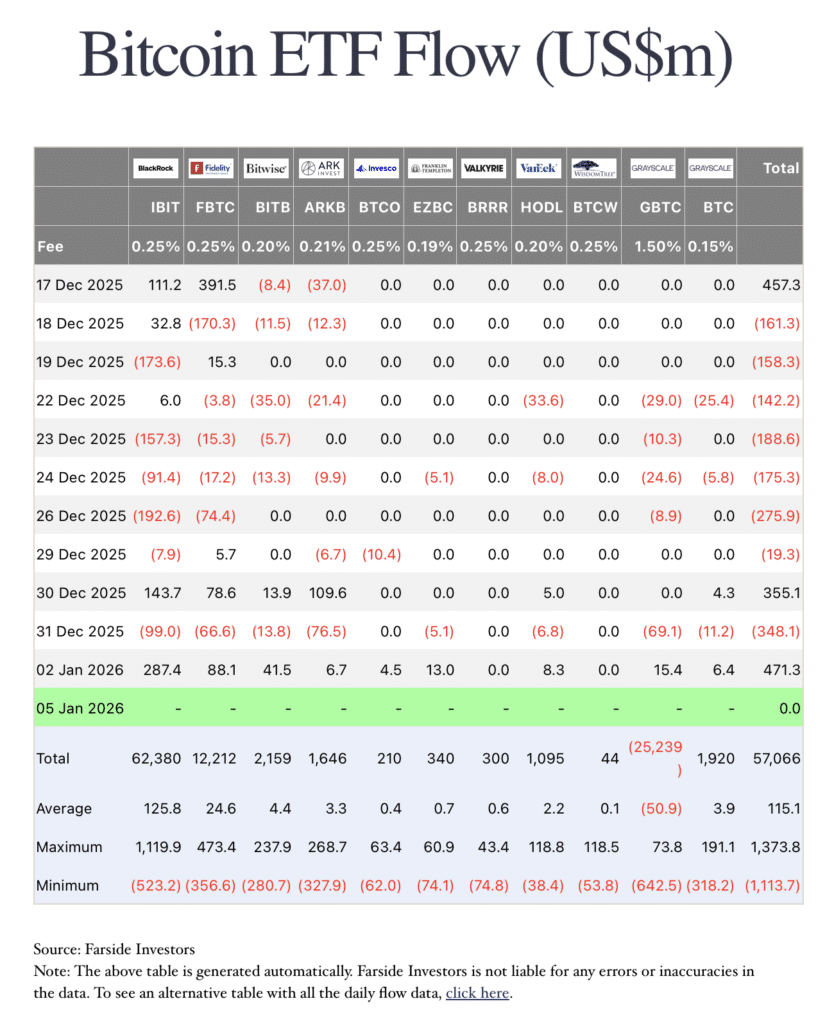 Nach einer Reihe zahlreicher Tage mit deutlichen Abflüssen, verbuchte der 02. Januar laut Daten von Farside wieder positive Zuflüsse von 471,3 Milliarden US-Dollar in Bitcoin-ETFs. BlackRocks iShares Bitcoin Trust (IBIT) wie so oft stark dabei mit rund 287 Millionen US-Dollar; Fidelitys FBTC folgte mit 88 Millionen US-Dollar, Bitwise mit 41,5 Millionen US-Dollar.