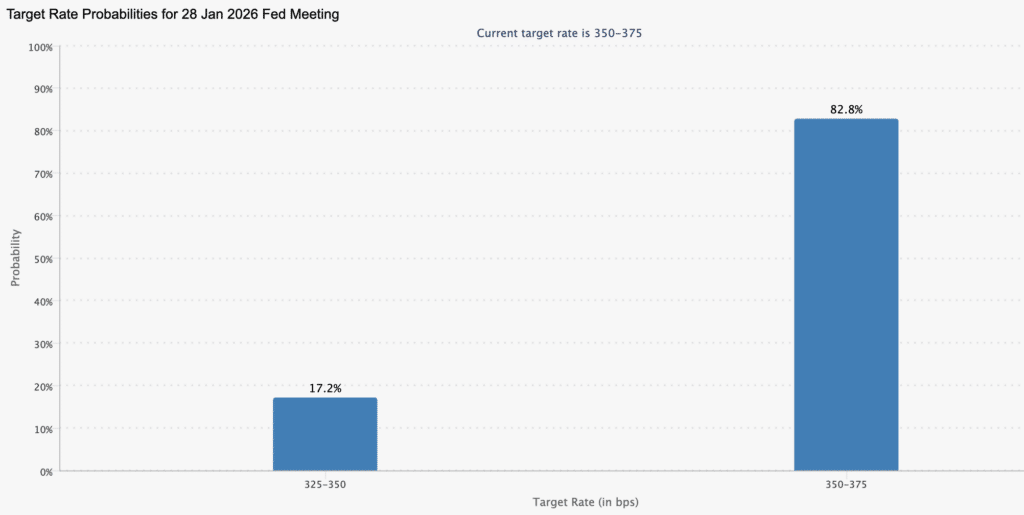 Ob es dort direkt eine weitere Zinssenkung gibt, wird am Markt derzeit eher skeptisch gesehen. In Bezug auf das **CME FedWatch-Tool** liegt die Wahrscheinlichkeit für ein Gleichbleiben des aktuellen Zinssatzes bei 83 Prozent. Auf Polymarket wird gar von 90-prozentiger Wahrscheinlichkeit davon ausgegangen, dass es eine Zinspause geben wird.