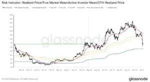 Darunter rückt der realisierte Preis bei rund 55.000 US-Dollar in den Fokus – jener Durchschnittswert, zu dem die derzeit umlaufenden Coins zuletzt transferiert wurden. Diese Kennzahl fungiert historisch häufig als mittelfristige Unterstützungsmarke.