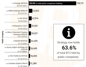 Mit einem Anteil von rund 63,6 Prozent an allen durch Aktiengesellschaften gehaltenen Beständen fungiert Strategy heute faktisch als börsennotiertes Vehikel für Bitcoin-Investitionen.