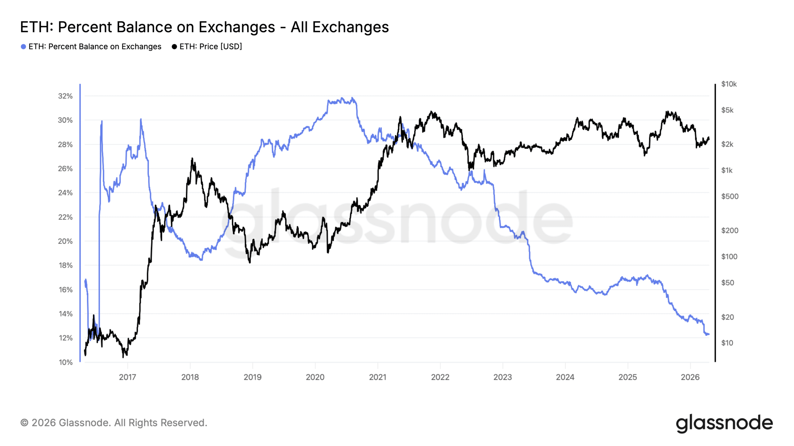 Eine weitere zentrale On-Chain-Metrik unterstreicht die zunehmende Angebotsverknappung bei Ethereum: Der Anteil der ETH-Bestände auf Börsen ist auf den niedrigsten Stand seit 2016 gefallen. Damit befindet sich diese Kennzahl auf einem Niveau, das zuletzt vor fast einem Jahrzehnt beobachtet wurde – lange bevor DeFi, NFTs oder institutionelle Nachfrage überhaupt eine Rolle spielten.