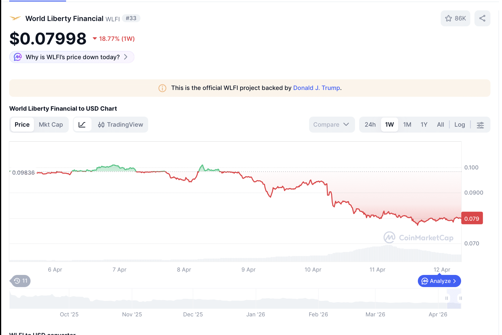 Parallel dazu geriet auch der Kurs deutlich unter Druck. Laut CoinMarketCap fiel WLFI am 11. April auf ein neues Allzeittief bei 0,07714 US-Dollar und notierte zuletzt nur noch knapp bei 0,08 US-Dollar. Damit hat der Markt die jüngsten Schlagzeilen unmittelbar eingepreist.