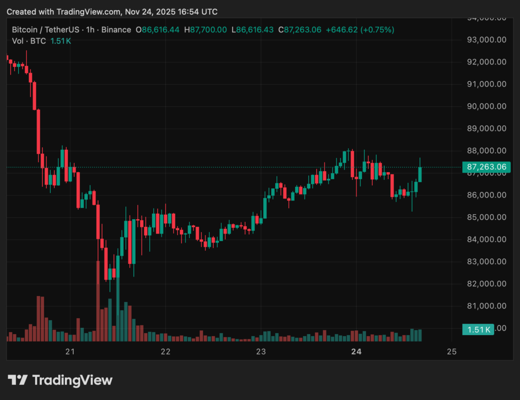 Bitcoin handelt am 24. November am Nachmittag bei rund 87.000 US-Dollar und liegt damit noch immer mehr als 30 Prozent unter dem Allzeithoch von gut 126.000 US-Dollar, das Anfang Oktober markiert wurde. Nach Monaten unermüdlichen Wartens auf “den Bullrun” wirkt der Rückgang wie ein harter Stimmungsbruch: Der Crypto Fear & Greed Index ist in den Bereich „Extreme Angst“ bei einem Wert von 12 gefallen.