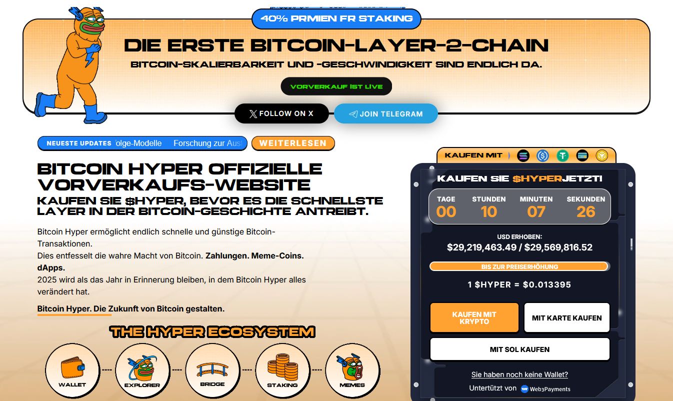 Wer sich frühzeitig positionieren möchte, kann jetzt Bitcoin Hyper kaufen und von möglichen Vorteilen bei der weiteren Entwicklung profitieren. Die aktuelle Bitcoin Hyper Prognose zeigt ebenfalls, dass das Projekt auf zunehmendes Interesse stößt.