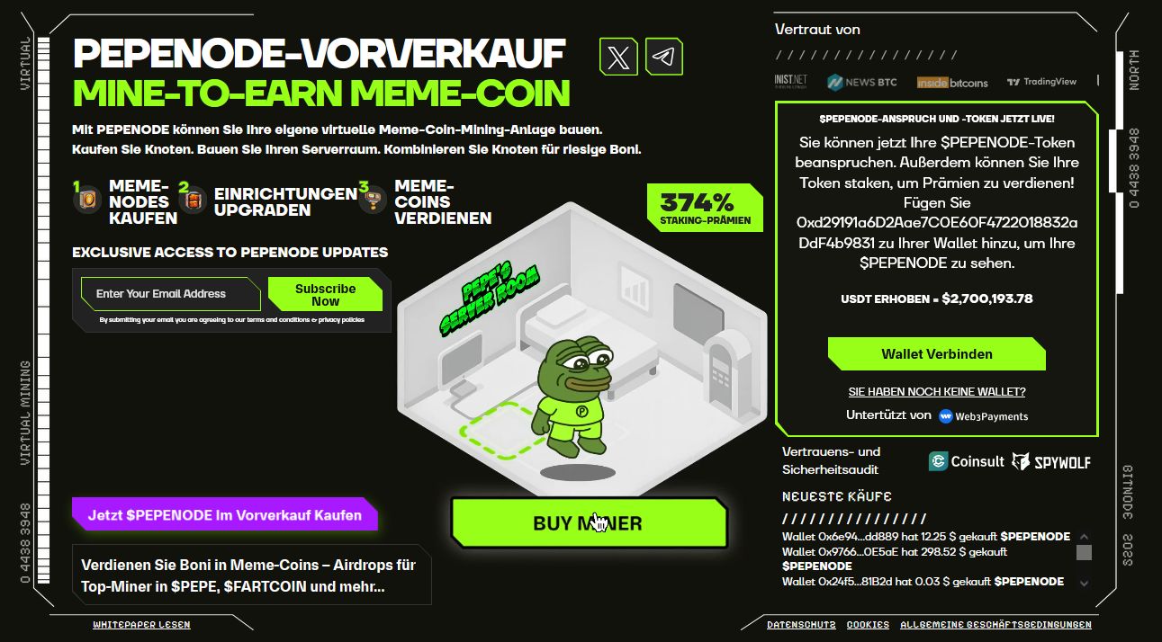 Der neue Meme-Coin setzt weniger auf Hype, sondern überzeugt mit einem „Mine-to-Earn“-Ansatz, bei dem Nutzer virtuelle Mining-Rigs betreiben und dafür Belohnungen in Kryptowährung erhalten. Schon am 08. Januar verließ PepeNode den Vorverkauf und wurde dann auf den ersten DEX gelistet – weitere Kryptobörsen sollen folgen.