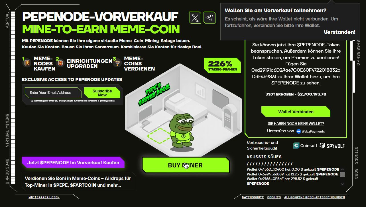 Das Risiko ist deshalb hoch. Wie viele Meme-Coins steht auch PEPENODE vor der Herausforderung, über den Hype hinaus Relevanz zu beweisen. Sollte es gelingen, eine stabile Spieler-Community rund um das Mining-Game aufzubauen und Listings auf größeren Börsen zu erreichen, könnte sich der Wert deutlich steigern. Bleibt dieser Erfolg aus, droht der schnelle Abstieg.