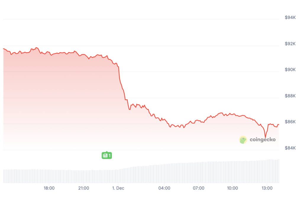 Der Bitcoin-Kurs lag am selben Tag bei knapp 91.000 US-Dollar, bevor der Renditeschock aus Japan einen weiteren Rücksetzer auslöste und den Kurs jenseits der 90.000 US-Dollar trieb. Aktuell notiert der Kurs laut Daten von Coingecko bei 85.900; 6.4 Prozent weniger als noch am Vortag.