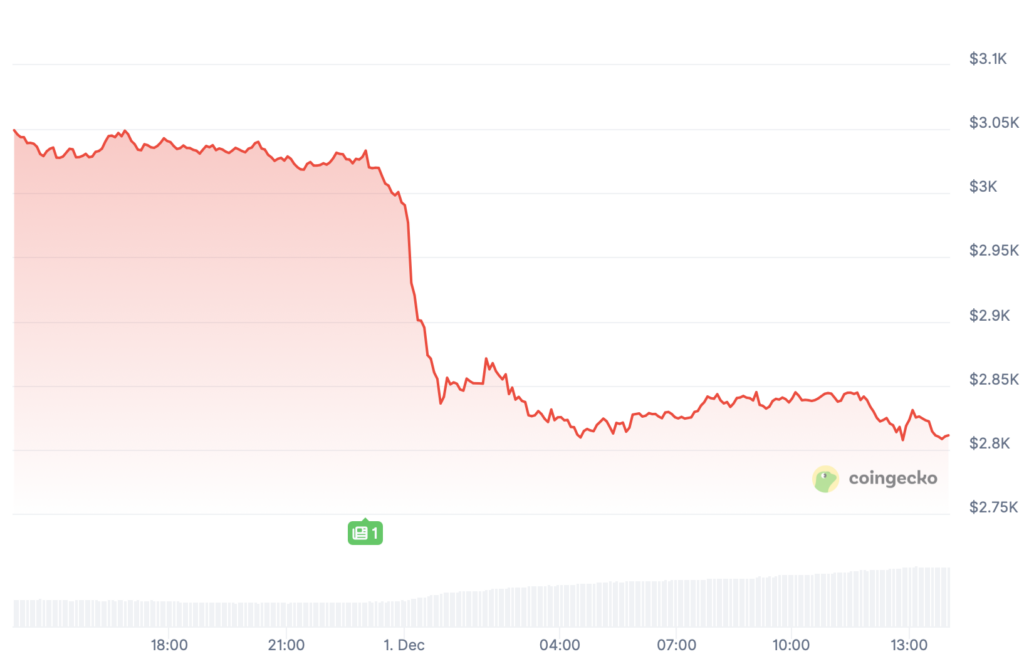 Auch Ethereum tut sich schwer: Auch wenn der Kurs hart versucht hat, die 3000 US-Dollar-Marke zurückzuerobern, haben die Bären vorerst die Oberhand. Der Kurs steht aktuell bei etwa 2,800 US-Dollar, ebenfalls ein Verlust von 7,3 Prozent zum Vortag.