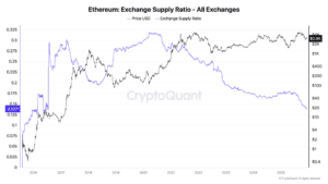 Parallel zur zähen Kursentwicklung erlebt Ethereum gerade eine der stärksten Angebotsverknappungen seiner Geschichte. Laut Daten von CryptoQuant ist etwa das „Ethereum Exchange Supply Ratio“ auf 0,137 gefallen – ein Niveau, das zuletzt 2016 erreicht wurde.