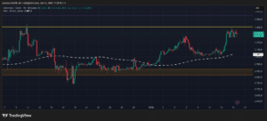 Damit notiert der Kurs zwar am oberen Rand seines seitwärts gerichteten Trendkanals, signalisiert jedoch weiterhin Schwäche, da der Preis unterhalb des letzten lokalen Hochs verbleibt.