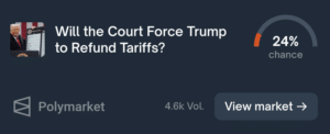 Auch die Wettmärkte machen mit mit: Auf Polymarket lag die implizite Wahrscheinlichkeit dafür, dass der Supreme Court zugunsten von Trumps Zollbefugnissen entscheidet, zuletzt bei aktuell 24 Prozent; der Markt sieht eher die Gegenrichtung. Das ist natürlich noch längst keine Prognose, aber ein Stimmungsmesser, wo die Reise weiter hingehen könnte.