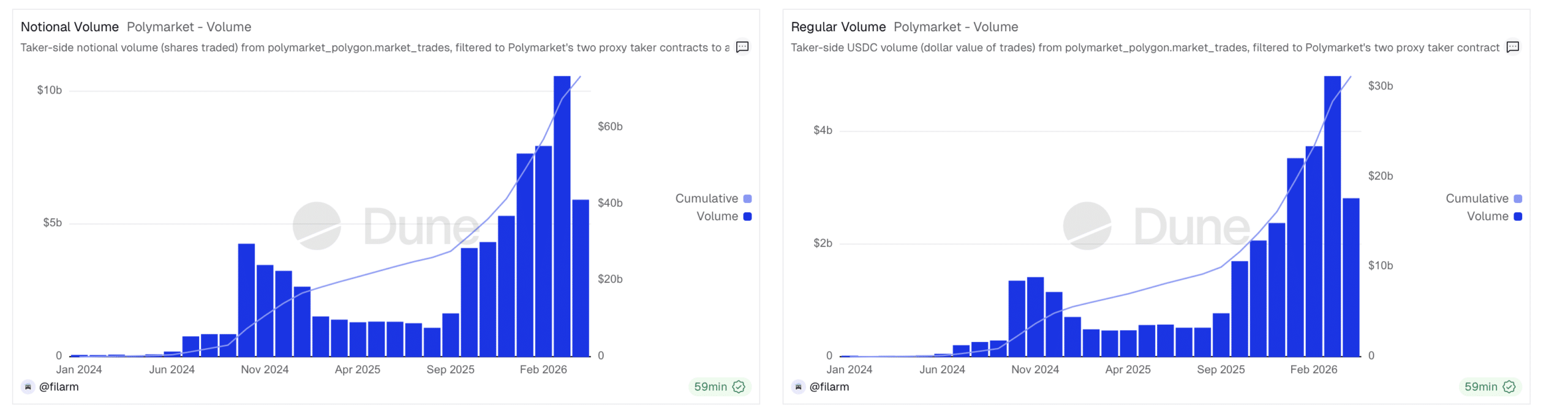 Parallel dazu explodiert auch das Handelsvolumen. Das monatliche Notional Volume hat sich von nahezu irrelevanten Werten Anfang 2024 auf zuletzt über 10 Milliarden US-Dollar gesteigert. Auch das tatsächliche Handelsvolumen in USDC zeigt eine ähnliche Entwicklung und erreicht inzwischen mehrere Milliarden pro Monat. Besonders stark ist die Beschleunigung seit Ende 2025, was darauf hindeutet, dass sowohl Retail- als auch institutionelle Teilnehmer verstärkt in den Markt drängen.