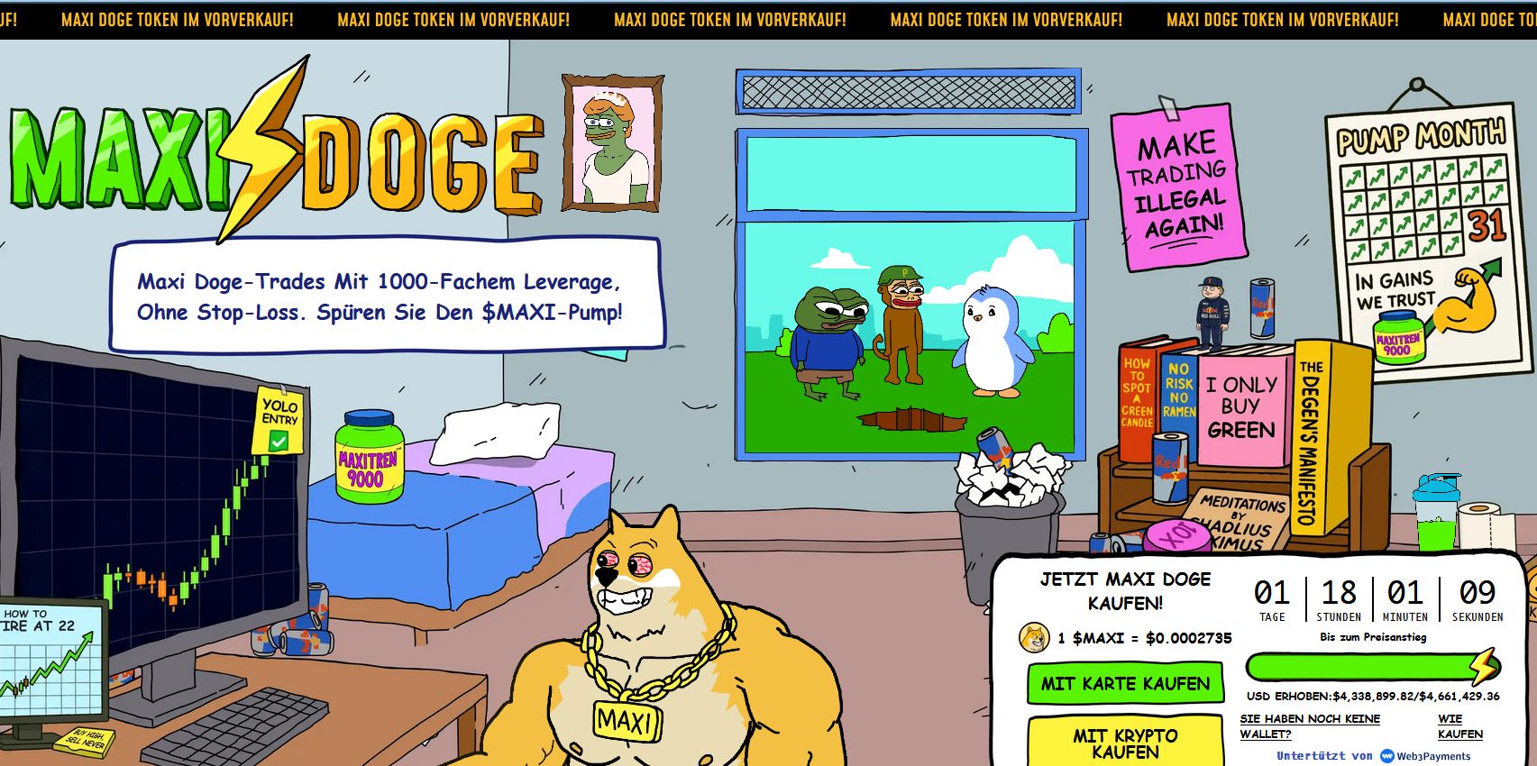 Gym Bro Humor: Maxi Doge setzt auf einen klassischen Meme-Coin-Ansatz, der sich an die “Top Dogs” der Krypto-Welt richtet. Hier lockt das Projekt mit wöchentlichen Leaderboards und “Max Ripped, Max Gains”-Wettbewerben.