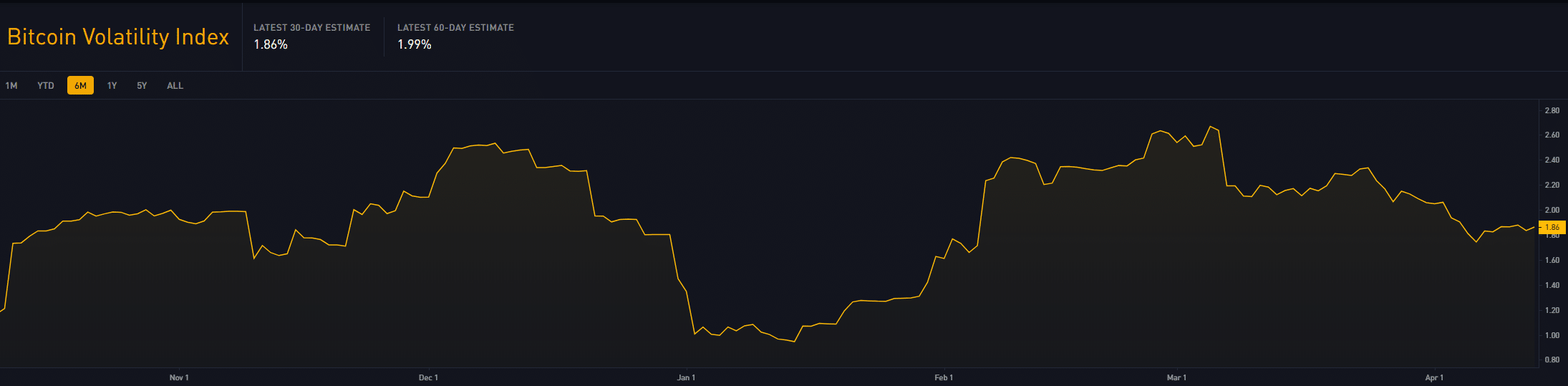 Die Bitcoin-Volatilität der vergangenen 12 Monate in der Übersicht (Quelle: bitbo.io/volatility)