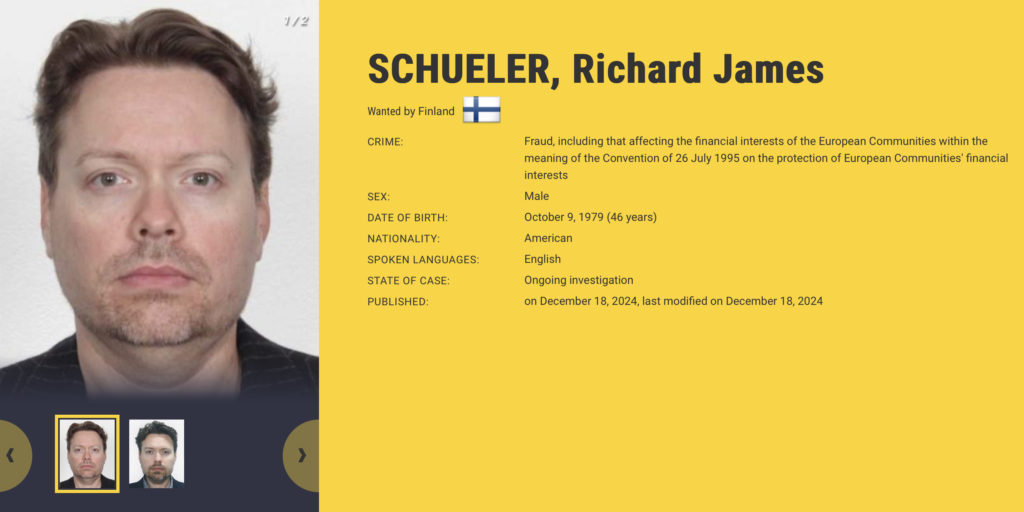 Unabhängig davon läuft in Europa seit Dezember 2024 eine Fahndung: Europols „Europe’s Most Wanted“ führt Richard James Schueler (alias Richard Heart) als „Wanted by Finland“, u. a. wegen mutmaßlicher Steuerdelikte.