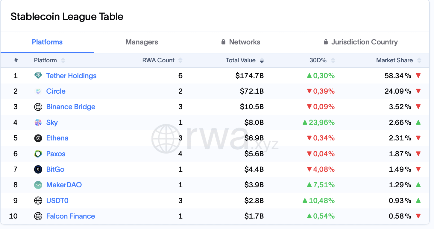 Der Stablecoin-Markt bleibt einer der klarsten Product-Market-Fits im gesamten Krypto-Sektor. Mit einem Gesamtvolumen von über 270 Milliarden US-Dollar dominieren zwei Anbieter das Feld: Tether Holdings und Circle. Circle positioniert sich dabei als die klare Nummer zwei mit rund 72,1 Milliarden US-Dollar an verwaltetem Stablecoin-Kapital und einem Marktanteil von über 24 %.