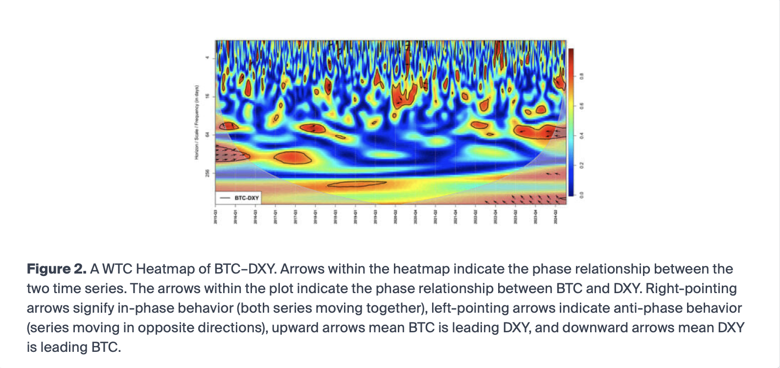 Eine Peer-reviewte Forschung erschienen Mai 2025 im *Journal of Risk and Financial Management* zeigt allerdings auch, dass Bitcoin im Vergleich zu klassischen USD-Assets eine schwächere und wechselhaftere Kopplung an den DXY hat. Dabei werden Bitcoin und der US-Dollar-Index (DXY) mit Wavelet-Methoden über verschiedene Zeit- und Frequenzbereiche analysiert.