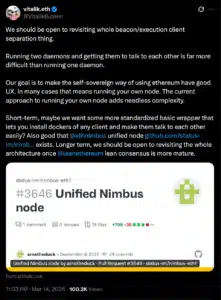 Der Kern der aktuellen Initiative findet sich in einem technischen Änderungsvorschlag, den Buterin kürzlich veröffentlichte und der eine radikale Vereinfachung der Node-Architektur vorsieht.