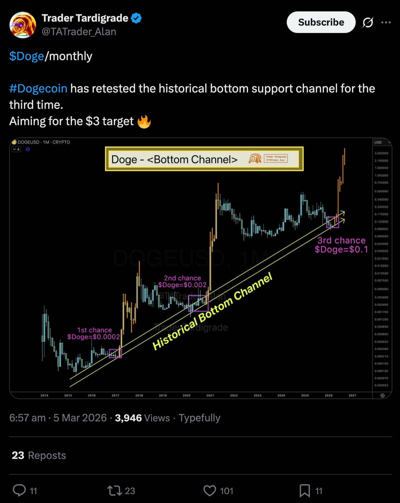 El analista experto Trader Tardigrade ha incrementado gradualmente sus pronósticos alcistas para Dogecoin, con su último gráfico de DOGE apuntando a los 3 $ para finales de este año.