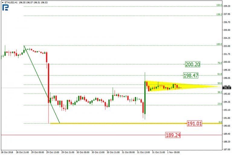 On H1, Ether is most likely correcting after the previous heavy downtrend. Currently, this correctional move reached 61.80% Fibo. Locally, the crypto is forming a tightening triangle, which should lead to the end of consolidation. If the pattern’s upper boundary is broken out, the price will reach $200.20, or 76% Fibo. Conversely, of the lower boundary gets broken out, Ether may reach the low at $191.24, and then the fractal at $189.24.