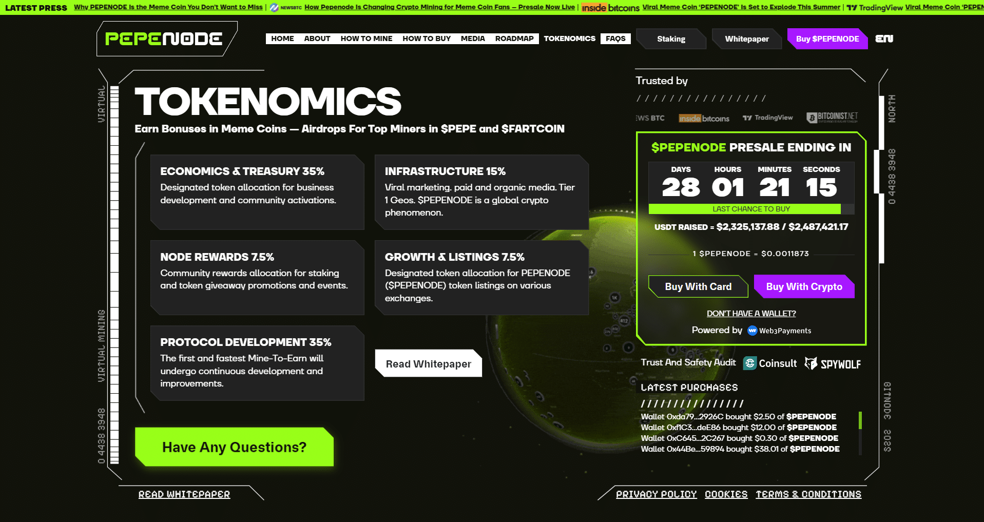 La possibilité de rejoindre la prévente PepeNode arrive à son terme. Pour participer tant qu’il est encore temps, il suffit de se rendre sur le site de la prévente afin d’acheter des tokens PEPENODE en utilisant de l’ETH, du BNB, de l’USDT (ERC-20 et BEP-20), ou encore une carte de crédit ou de débit.