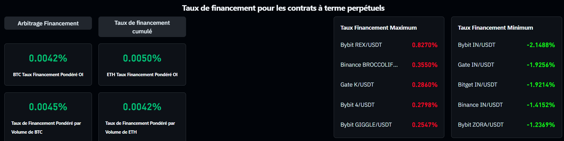 Malgré cette pression, le taux de financement reste positif, signe que les traders conservent un biais haussier.