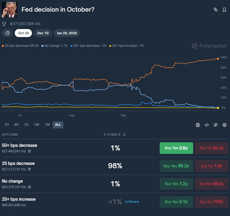 Selon Polymarket, les investisseurs évaluent à 98 % la probabilité d’une telle décision. Autrement dit, un pari de 100 $ sur l’hypothèse « aucun changement » rapporterait environ 7 692 $ si elle se révélait juste.